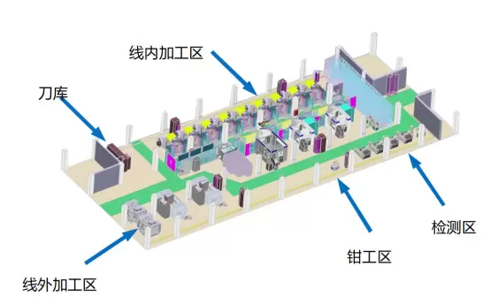圖2:航空工業(yè)東方的柔性生產(chǎn)線總長33米,集成了13臺加工中心和1臺清洗設(shè)備,可實(shí)現(xiàn)自動排產(chǎn)生產(chǎn),