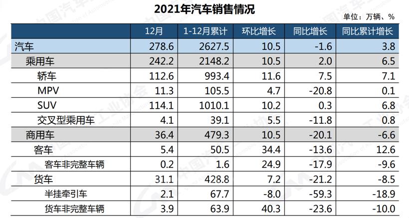 整個(gè)2021年,我國(guó)汽車產(chǎn)銷2608.2萬輛和2627.5萬輛,同比增長(zhǎng)3.4%和3.8%,結(jié)束了自2018年以來連續(xù)三年下降趨勢(shì)。