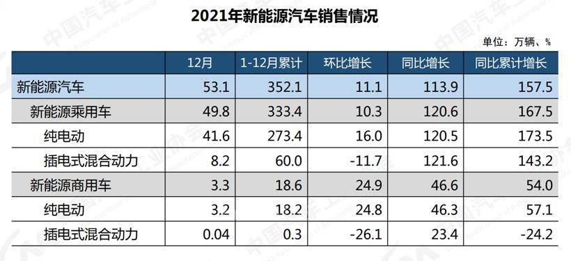 新能源汽車市場(chǎng)表現(xiàn)依然出色,12月產(chǎn)銷量雙雙超過50萬輛,再創(chuàng)新高,分別達(dá)到51.8萬輛和53.1萬輛,環(huán)比增長(zhǎng)6.7%和11.2%,同比增長(zhǎng)1.2倍和1.1倍。2021年,新能源汽車產(chǎn)銷分別達(dá)到354.5萬輛和352.1萬輛,同比增長(zhǎng)均為1.6倍,全年市場(chǎng)占有率提升至13.4%,進(jìn)一步說明了新能源汽車市場(chǎng)已經(jīng)從政策驅(qū)動(dòng)轉(zhuǎn)向市場(chǎng)拉動(dòng)。