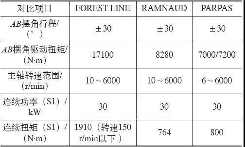 意大利的RAMNAUD和PARPAS生產(chǎn)的設備體積、功率和扭矩等相對較小,在鈦合金結(jié)構件加工尤其是粗加工時顯得能力不足,主要配套立式加工中心進行小型零件的加工。法國FOREST-LINE生產(chǎn)的AB擺角銑頭剛性足、扭矩大,主軸具有多擋變速,最大轉(zhuǎn)速可以達到6000r/min,不僅可以進行鈦合金的粗、精加工,而且能兼顧鋁合金結(jié)構件的加工。但其結(jié)構較為復雜,所有傳動環(huán)節(jié)都在箱體內(nèi)部,雖然顯得很緊湊,但是加工和裝配難度非常大,對加工設備、加工工藝、人員素質(zhì)及工裝夾具等要求都很高,一定程度上影響了加工可靠性和品質(zhì)一致性,高昂的生產(chǎn)成本也降低了市場競爭力。表1為國外幾款AB擺角頭技術參數(shù)對比。