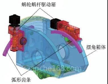 AB擺角銑頭驅(qū)動采用伺服電動機驅(qū)動蝸輪蝸桿箱變速増扭,并通過其輸出齒輪與大直徑弧形齒條嚙合進一步放大扭矩,來實現(xiàn)AB擺角機構的大扭矩驅(qū)動,傳動鏈速比>1000,驅(qū)動扭矩27000N·m以上。擺角頭結(jié)構采用模塊化設計, AB擺角驅(qū)動箱為通用獨立部件,降低加工、檢驗、裝配和維護難度和成本,提高產(chǎn)品的可靠性和穩(wěn)定性,便于產(chǎn)品系列化。