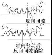 AB擺角銑頭驅(qū)動的第二級為齒輪弧形齒條傳動,也是側(cè)隙較大的一環(huán),所以也需要做消隙設計。通過彈簧形式的柔性調(diào)整可以實現(xiàn)自動補償,但會影響傳動平穩(wěn)性,且這種調(diào)整方式結(jié)構復雜,傳動剛性低,不滿足AB擺角銑頭要求的高剛性驅(qū)動。設計采用內(nèi)外雙齒輪軸,通過機構剛性調(diào)整兩輸出齒輪周向相對扭轉(zhuǎn)錯位,嚙合時,雙齒輪中的一個輪齒與相鄰弧形齒條輪齒的受力面嚙合,而雙齒輪的另外一個輪齒與相鄰輪齒的背面嚙合,從而達到消除齒側(cè)間隙的目的。