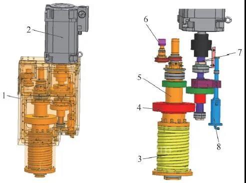 1-主軸箱體 2-主軸電動機 3-冷卻水套 4-齒輪 5-主軸 6-旋轉(zhuǎn)編碼器 7-傳動軸 8-換擋液壓缸