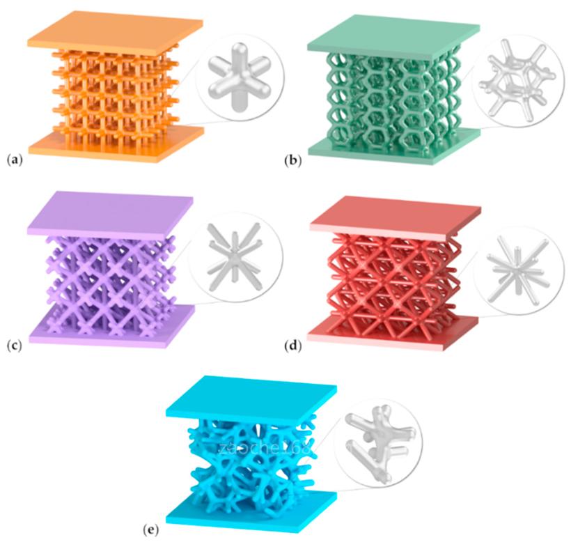 在Autodesk Netfabb 2021中設(shè)計的晶格結(jié)構(gòu),具有以下拓?fù)洌海╝)Grid;( b ) Hexagon;(c) Star;(d) Tetra;(e)Trabecular,連同擴(kuò)大的梁狀形狀。(圖片來源:AZOM)
