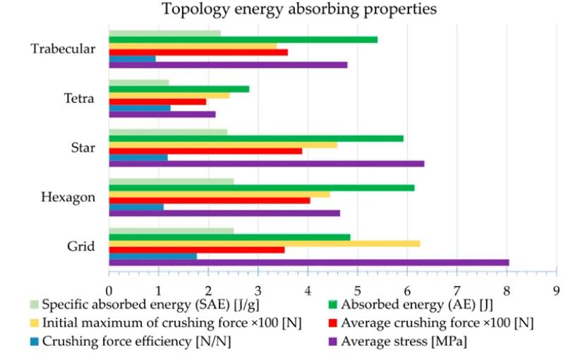 為了推進(jìn)這一領(lǐng)域的工作,文中對通過光固化快速成型(SLA)和V2耐用樹脂打印的五種梁狀結(jié)構(gòu)進(jìn)行了評估。每種結(jié)構(gòu)都表現(xiàn)出規(guī)則單元型拓?fù)洌@些單元周期性地相互連接和重復(fù),既保持了相對基本的設(shè)計,同時盡可能靈活提供不同的拓?fù)涮匦浴?BR> 這些結(jié)構(gòu)本身是使用Autodesk Netfabb 2021軟件生成的。這些不同類型的3D打印結(jié)構(gòu),分別被描述為網(wǎng)格(Grid)、六邊形(Hexagon)、星形(Star)、四向(Tetra)和小梁(Trabecular)。每個結(jié)構(gòu)都由具有相同公稱直徑的圓形截面的互連梁組成。在樣品的頂部和底部分別打印兩個平面面板。每個結(jié)構(gòu)測試5個樣本,總共探討25個樣本。