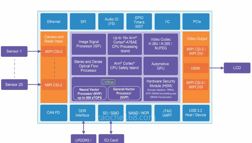 具體來看,相較于上一代CV2,CV3對CPU進行了大幅升級,搭載了多達 16 個 Arm? Cortex-A78AE CPU 內(nèi)核,這是Arm最新推出的高性能CPU內(nèi)核,由此使得CV3在支持自動駕駛系統(tǒng)的軟件應(yīng)用所需的 CPU 性能上,比CV2 提高了 30 倍。
