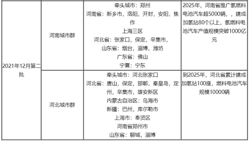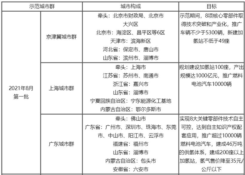 針對氫燃料電池汽車,我國采取了大力度的財(cái)稅支持政策,2020年發(fā)布《關(guān)于開展燃料電池汽車示范應(yīng)用的通知》,開啟燃料電池汽車以獎(jiǎng)代補(bǔ)(下圖1),2021年8月和12月共批準(zhǔn)包括上海、北京、廣東、河北、河南五大試點(diǎn)城市群(表1)。
