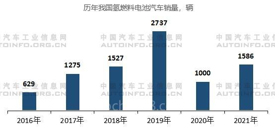 我國燃料電池汽車市場規(guī)模處在發(fā)展初期,2021年銷量僅有1586輛,比2020年有了明顯增長(2020年由于處于政策空窗期,銷量為近年低點(diǎn),僅有1000輛)。2022年,我國已經(jīng)批準(zhǔn)了五個(gè)示范城市群,在政策的推動(dòng)下,燃料電池汽車銷量會(huì)有一個(gè)明顯的上量。