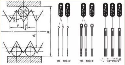 三針是一組具有確定的相同直徑的三根量針,以間接法測量螺紋中徑。通過將三根量針放入螺紋兩側(cè)牙槽中,配合杠桿千分尺測量整體外徑,通過螺紋中徑與量針直徑,牙型角以及螺距的函數(shù)關系,計算螺紋單一中徑。為簡化計算過程,要選用合適直徑的量針。