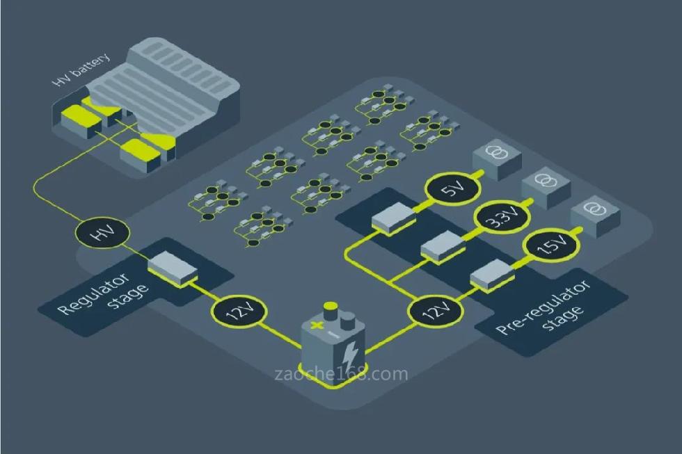 維護(hù)一款 12V 的物理電池,就意味著維護(hù)一個具有不必要冗余的低效率 PDN。在典型的汽車 12V PDN 中,所有連接 12V 母線的 12V 負(fù)載都有內(nèi)部前置穩(wěn)壓器,可將寬輸入電壓范圍(通常從 6V 到 16V)轉(zhuǎn)換為 5V、3.3V 或更低電壓。從全球系統(tǒng)角度來看,無論是電動汽車、混合動力汽車,還是插電式混合動力汽車,都有串聯(lián)穩(wěn)壓器冗余。一款從高壓到 12V 的 DC-DC 轉(zhuǎn)換器可為 12V 母線(效率高)穩(wěn)壓,而前置穩(wěn)壓器則可為每個負(fù)載提供合適的內(nèi)部電壓(圖 1)。