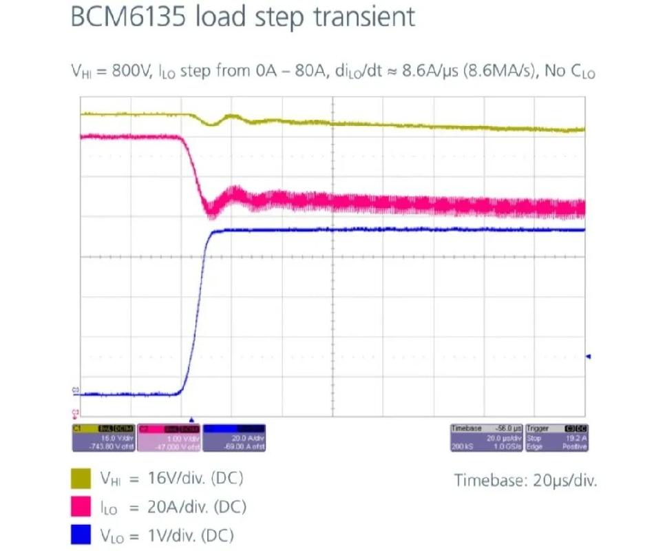 圖 3:BCM6135 的快速負(fù)載瞬態(tài)響應(yīng)是支持 12V 負(fù)載的關(guān)鍵。瞬態(tài)響應(yīng)為每秒 800 萬安培 (8MA/s)。黃色:輸入電壓 (800VDC),紅色:輸出電壓 (48V),藍(lán)色:輸出電流。