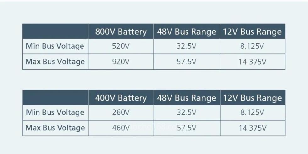 該 BCM 的固定比率屬性可確保虛擬電池保持在其適當(dāng)?shù)墓ぷ鞣秶鷥?nèi)。例如,在 800V 電池供電的電動汽車中,可確保高壓電池在 520 至 920V 之間。比率為 1/16 的 BCM6135 可為 48V 電池實現(xiàn)虛擬化,確保電壓范圍在 32.5 和 57.5V 之間。BCM6135 1/8 的比率可用于 400V 電動汽車(圖 3)。