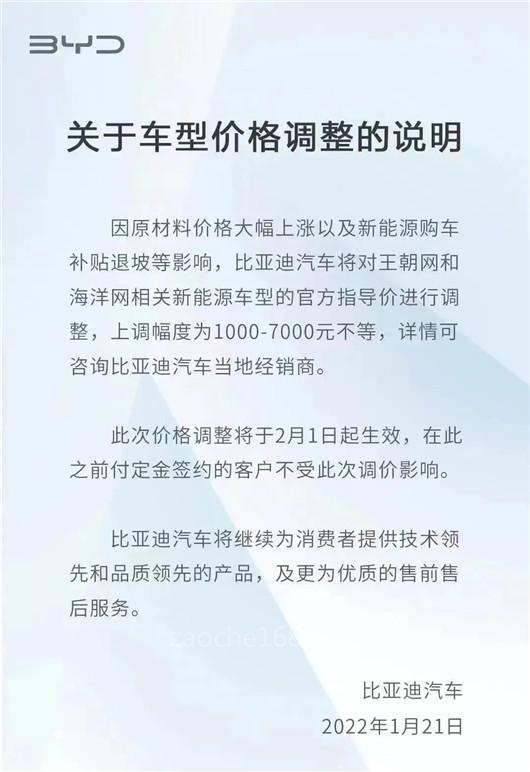 而繼特斯拉、小鵬宣布全系漲價(jià)后,近日從比亞迪官方獲悉,同樣受限于上述幾方面原因影響,將對(duì)王朝網(wǎng)和海洋網(wǎng)相關(guān)新能源車型的官方指導(dǎo)價(jià)進(jìn)行調(diào)整,上調(diào)幅度為1000-7000元不等,詳情可咨詢比亞迪汽車當(dāng)?shù)亟?jīng)銷商。此次價(jià)格調(diào)整將于2月1日起生效,在此之前付定金簽約的客戶不受此次調(diào)價(jià)影響。