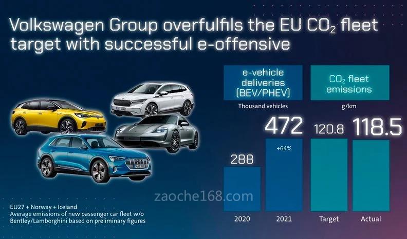 1月24日,大眾集團(tuán)在一份聲明中表示,該集團(tuán)包括大眾、奧迪、保時(shí)捷、斯柯達(dá)和西雅特品牌的新乘用車(chē)車(chē)隊(duì),2021年在歐盟實(shí)現(xiàn)了平均每公里不多于118.5克的二氧化碳排放量。這一數(shù)字比歐盟為大眾集團(tuán)設(shè)定的目標(biāo)低了2%。