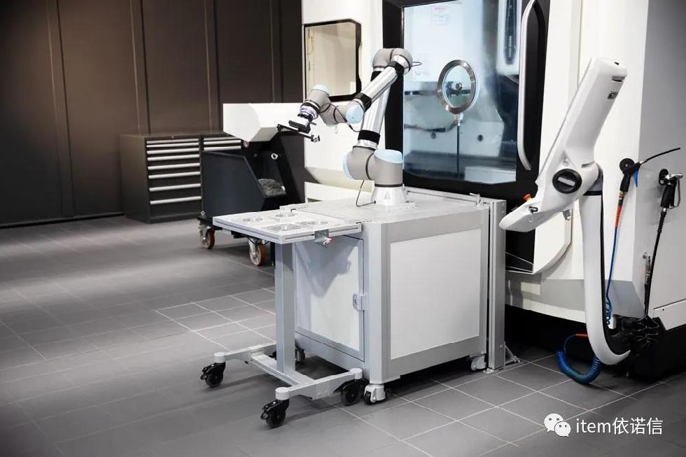 將協(xié)作機器人安裝在移動式機器人手推車上時,可以輕松地將其推到上下料時所處的位置。機器人被鎖定在固定的預(yù)設(shè)點上,便可以精準(zhǔn)地抓取和定位工件。為協(xié)作機器人配上攝像頭系統(tǒng)和支持人工智能的控制裝置后,就能自主糾正定位不精確的工件。在涉及數(shù)控銑削和處理鋒利或尖銳工件的生產(chǎn)步驟中,為保證相應(yīng)的安全性,還可以將協(xié)作機器人安裝在移動式機柜中,從而確保其在協(xié)作機器人和設(shè)備附近安全工作。