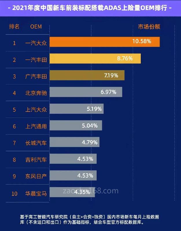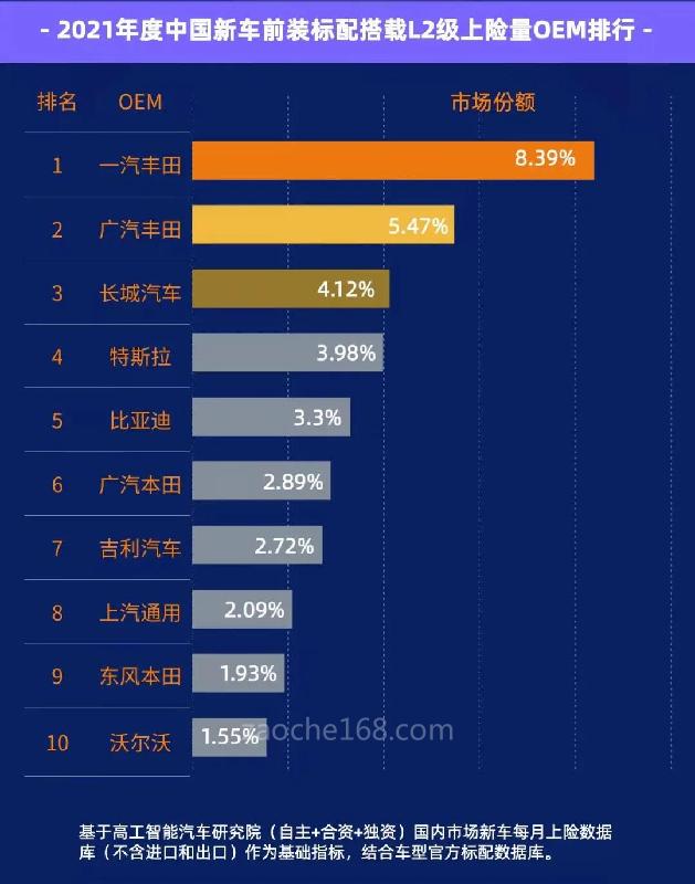 特別需要提到的是,在L2級(jí)別ADAS搭載量方面,中國(guó)汽車品牌表現(xiàn)出強(qiáng)勁的勢(shì)頭,長(zhǎng)城汽車、比亞迪、吉利汽車均進(jìn)入了前十榜單,其中長(zhǎng)城汽車僅次于一汽豐田與廣汽豐田,位列第三,上險(xiǎn)量遠(yuǎn)遠(yuǎn)超過(guò)了一眾合資品牌。