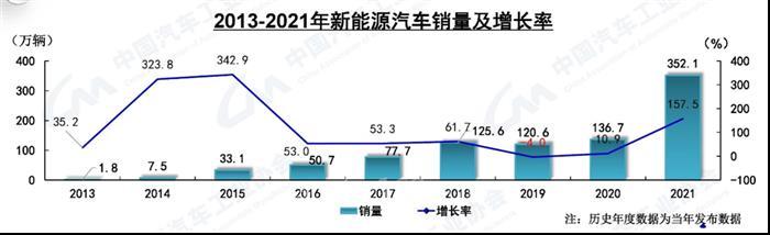 2021年,在全球疫情的影響下,我國新能源汽車產銷量依然呈爆發(fā)式增長。中汽協(xié)數據顯示,2021年,我國新能源汽車銷量352.1萬輛,同比增長1.6倍,連續(xù)7年位居全球第一,市場占有率達到13.4%,高于上年8個百分點。