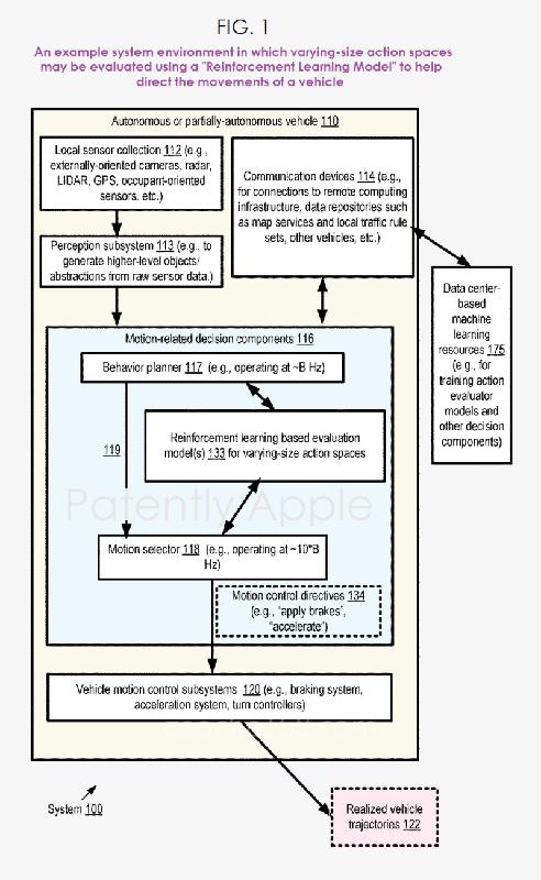 蘋果的專利圖1為系統(tǒng)環(huán)境示例圖,其中可以使用強化學習模型評估不同大小的動作空間,以助力指導車輛運動。在各種實例中,乘員可能會忽略車輛的決策組件做出決定,甚至暫時禁用車輛的決策組件;此外,在至少一個實例中,車輛的決策部件可以請求或要求乘員在特定條件下做出決策。
