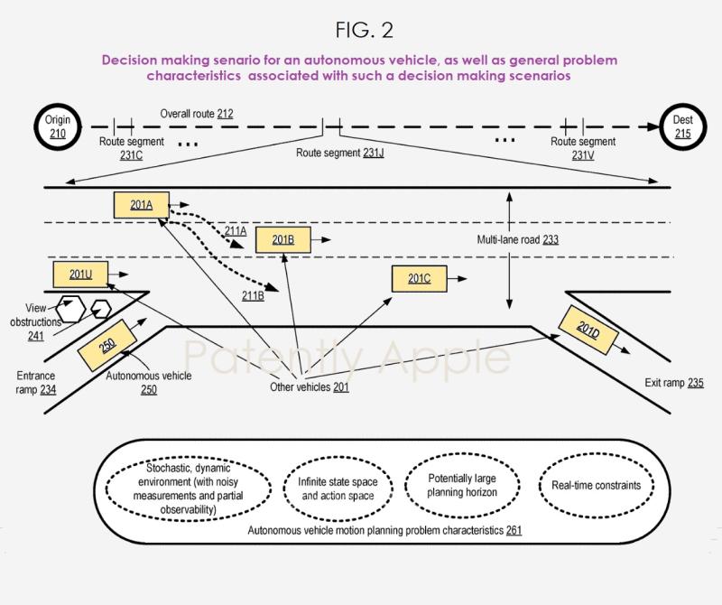 蘋果專利圖2為自動駕駛車輛決策場景的示例圖,并展示了此類決策場景的相關問題特征。該系統(tǒng)必須了解駕駛員當前路線以及并道的方式和時間;何時駛出坡道或變道;了解多種車速,以確保并道安全;檢測路況;了解路標和路燈(停車、小心、前行)等等。該系統(tǒng)需要實時處理很多信息。