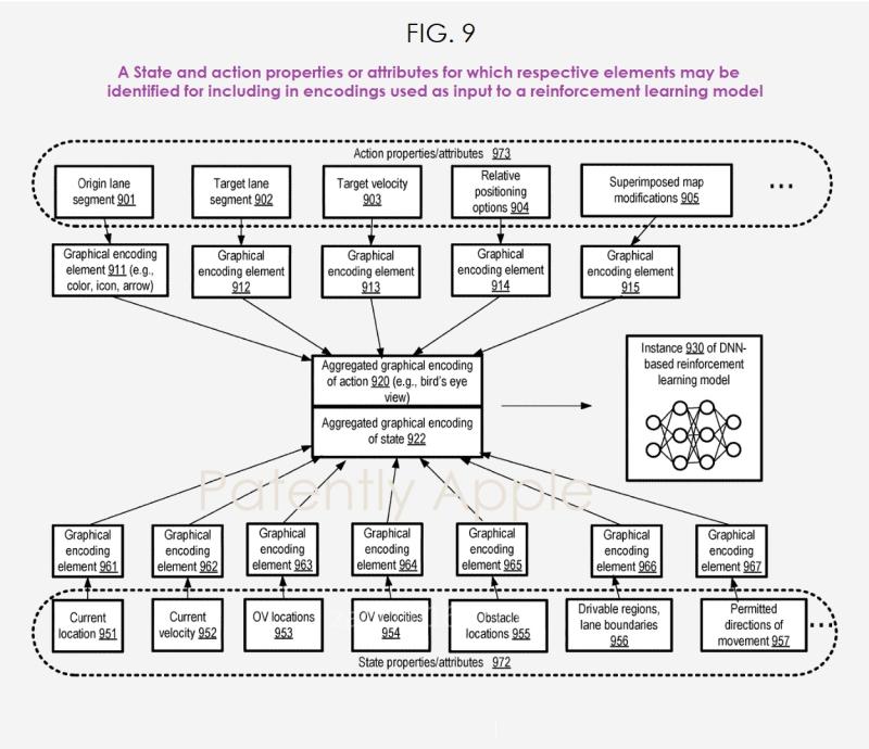 蘋果專利圖9為狀態(tài)和動作屬性或?qū)傩缘氖纠?,其中的對應因素可被識別僅編碼中,用于輸入強化學習模型。