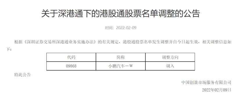 2月9日,深交所發(fā)布公告稱,根據(jù)《深圳證券交易所深港通業(yè)務(wù)實施辦法》的有關(guān)規(guī)定,將小鵬汽車納入深港通下的港股通股票名單,自2月9日起正式生效。受此利好消息影響,小鵬汽車當(dāng)日盤前漲超7%。