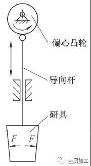 結(jié)合零件結(jié)構(gòu)特征和研磨工藝要求設計工裝工作原理,如圖2所示,研具在一定作用力F下與密封面貼合,同時在偏心凸輪轉(zhuǎn)動下,通過導向桿帶動在一定范圍內(nèi)的上、下往復運動,從而實現(xiàn)對密封面微切削,達到研磨效果[1]。