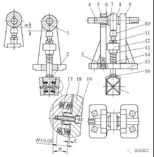 為保證間隙e均勻一致,對式中H深度公差控制在±0.05mm內(nèi),支撐彈簧精度滿足GB/T 23934-2015《熱卷圓柱螺旋壓縮彈簧技術條件》中2級要求[4]。