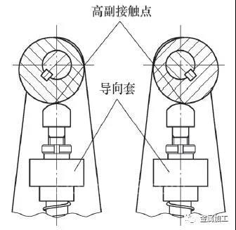 (3)支架連接部分 為保證工裝與閥體零件裝配適應性,利用閥體中腔結(jié)構(gòu)設計與之匹配的基座,并在其上端兩側(cè)設置支架以滿足傳動軸旋轉(zhuǎn)傳動需要。因偏心凸輪與調(diào)整桿高副接觸點隨著偏心凸輪轉(zhuǎn)動而擺動(見圖4),故需在導向桿中部增加導向,以避免卡死的情況發(fā)生。