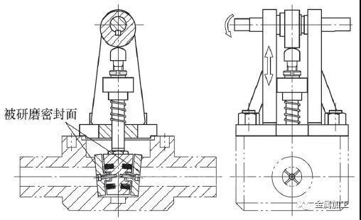 將本工裝安裝于閥體中腔部位,同時用螺柱、螺母緊固,向閥腔內(nèi)添加一定量的研磨劑后,通過外界驅(qū)動傳動軸旋轉(zhuǎn)后帶動偏心凸輪轉(zhuǎn)動,轉(zhuǎn)速控制在50~60r/min,從而帶動研磨板在一定范圍內(nèi)做上、下往復運動,在支撐彈簧作用下,使得研磨板與密封面之間產(chǎn)生研磨作用,從而實現(xiàn)研磨運動(見圖5),完成研磨后,松開螺柱、螺母,即可取出本工裝。
