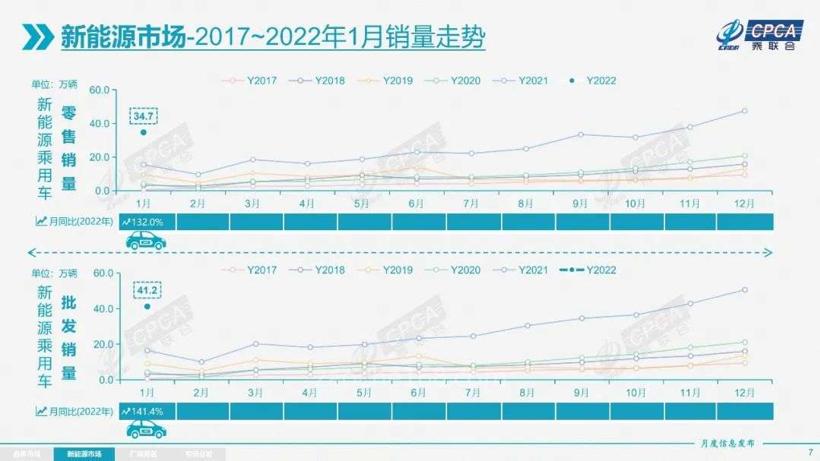 新能源汽車依然是銷量主力軍。乘聯(lián)會(huì)數(shù)據(jù)顯示,1月新能源乘用車批發(fā)量達(dá)到41.1萬輛,同比增長(zhǎng)141.4%;零售量達(dá)到34.7萬輛,同比增長(zhǎng)132%。其中純電動(dòng)車批發(fā)銷量為33.3萬輛,同比增長(zhǎng)130.4%;插電混動(dòng)銷量7.9萬輛,同比增長(zhǎng)202.1%。