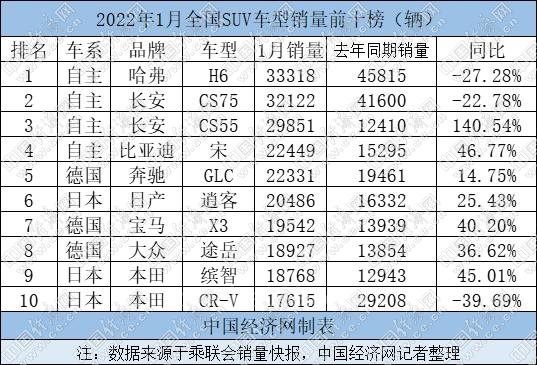 具體來看,1月,哈弗H6、長(zhǎng)安CS75、長(zhǎng)安CS55和比亞迪宋四大自主車型“雄踞”SUV月度銷量前四,且銷量均超2萬(wàn)輛。其中,在2021年罕見地三次讓月度冠軍旁落的哈弗H6,1月雖以33318輛的成績(jī)奪冠,但同比27.3%的下滑幅度仍盡顯疲態(tài),面對(duì)身后對(duì)手們“氣勢(shì)洶洶”的追趕,絲毫大意不得。