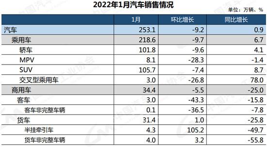 中汽協(xié)方面認(rèn)為,1月,汽車產(chǎn)銷形勢總體平穩(wěn),受芯片供應(yīng)繼續(xù)小幅改善的支撐,疊加部分地方出臺鼓勵汽車消費(fèi)政策的拉動,乘用車表現(xiàn)好于總體水平,產(chǎn)銷同比延續(xù)了穩(wěn)定增長態(tài)勢;商用車產(chǎn)銷環(huán)比和同比則依然延續(xù)了下降趨勢,且同比降幅較為顯著。