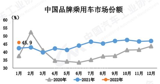 分國別來看,中國品牌乘用車1月共銷售汽車100.4萬輛,環(huán)比下降11.7%,同比增長15.9%,占乘用車銷售總量的45.9%,占有率比上月下降1.0個百分點,比上年同期提升3.7個百分點。