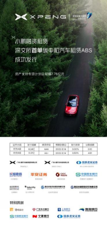 此次發(fā)行原始權(quán)益人為小鵬汽車旗下廣州小鵬汽車融資租賃有限公司。項(xiàng)目總規(guī)模7.75億元,獲得投資人的積極認(rèn)購,優(yōu)先A級(jí)(評(píng)級(jí)AAA)的票面利率3.0%,認(rèn)購倍數(shù)3.10,優(yōu)先B級(jí)(評(píng)級(jí)AA+)的票面利率3.50%,認(rèn)購倍數(shù)4.61,票面利率創(chuàng)下新勢力車企融資租賃ABS的新低,拓展了小鵬汽車的低成本融資渠道。