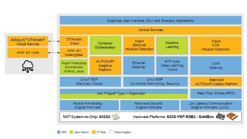 隨著汽車行業(yè)不斷向軟件定義汽車大規(guī)模轉(zhuǎn)變,ECU整合、數(shù)據(jù)驅(qū)動(dòng)的汽車服務(wù)、安全云連接和面向服務(wù)的架構(gòu)需要全新汽車軟件開(kāi)發(fā)方案。汽車制造商和一級(jí)供應(yīng)商面臨眾多挑戰(zhàn),涉及多個(gè)租約、網(wǎng)絡(luò)管理、云服務(wù)、功能安全和先進(jìn)安全技術(shù)。通過(guò)GoldVIP的預(yù)集成軟件,恩智浦可助力應(yīng)對(duì)上述挑戰(zhàn),包括來(lái)自合作伙伴Airbiquity、亞馬遜網(wǎng)絡(luò)服務(wù)、Argus Cyber Security和Elektrobit的軟件。