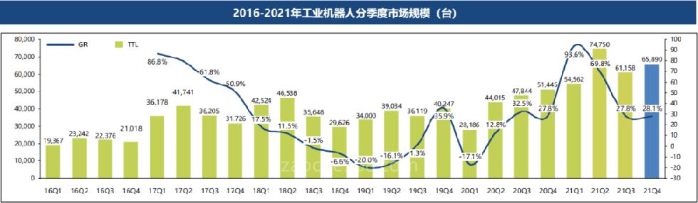 縱觀2021,中國(guó)工業(yè)機(jī)器人市場(chǎng)上半年整體保持高速增長(zhǎng),下半年雖增速放緩,但全年仍保持上升趨勢(shì)。
