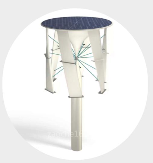 Change Wind Corporation公司開(kāi)發(fā)了Wind & Solar Tower。每座塔占地不足22平方英尺,高度為82英尺,有6個(gè)可以隨風(fēng)旋轉(zhuǎn)的垂直軸葉片(六螺旋葉片風(fēng)力發(fā)電機(jī)),頂部配有自清潔太陽(yáng)能電池板。作為一種自供電的大容量電動(dòng)汽車(chē)充電系統(tǒng),Wind & Solar Tower可在不增加電網(wǎng)負(fù)載的情況下運(yùn)行。每年可產(chǎn)生169000 kWh的清潔電力,足以為車(chē)輛提供60萬(wàn)英里的續(xù)航里程。