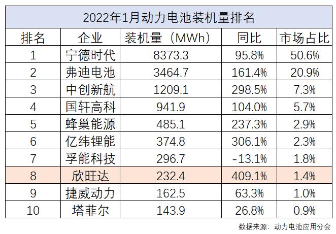 進(jìn)入2022年,欣旺達(dá)動力電池出貨量有提升的跡象。據(jù)動力電池應(yīng)用分會數(shù)據(jù)顯示,2022年1月,欣旺達(dá)動力電池裝機(jī)量達(dá)到232.4MWh位居第8,同比增幅達(dá)409.1%,不僅增速遙遙領(lǐng)先,而且是前10名中唯一增速超過400%的公司。