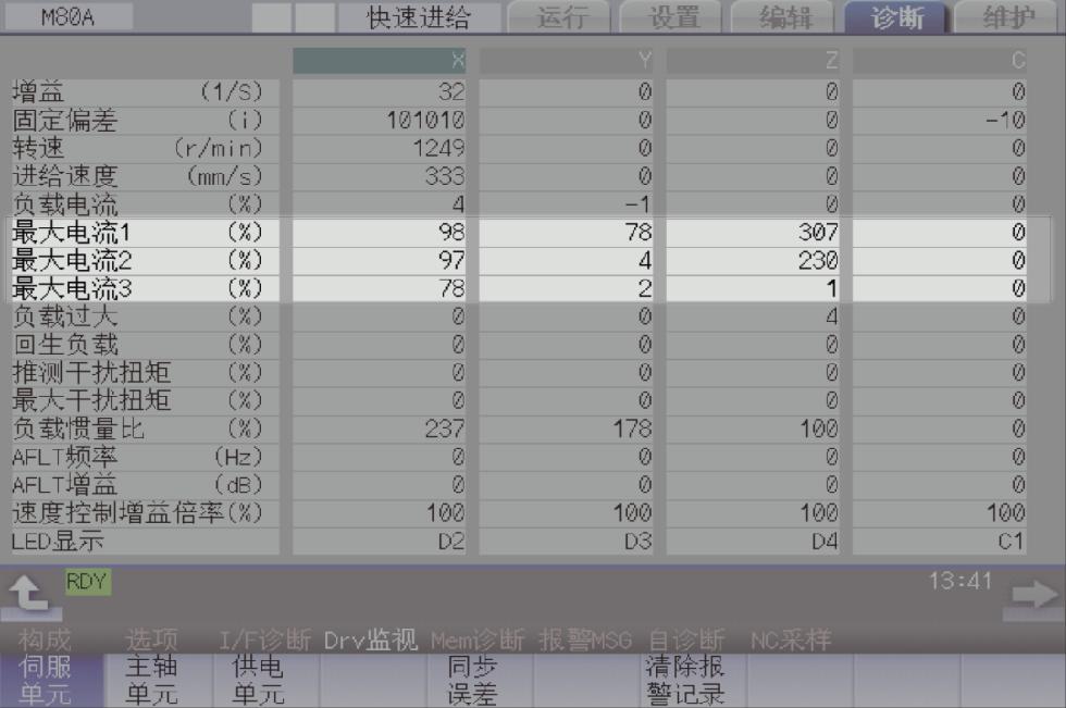 ①相同類型機(jī)臺對比,進(jìn)給軸電流明顯變大。