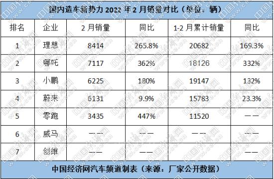 數(shù)據(jù)顯示,2月,理想、哪吒、小鵬、蔚來和零跑的銷量分別為8414輛、7117輛、6225輛、6131輛、3435輛,同比分別增長265.8%、362%、180%、9.9%、447%;前2個月的累計銷量分別為20682輛、18126輛、19147輛、15783輛、11520輛。