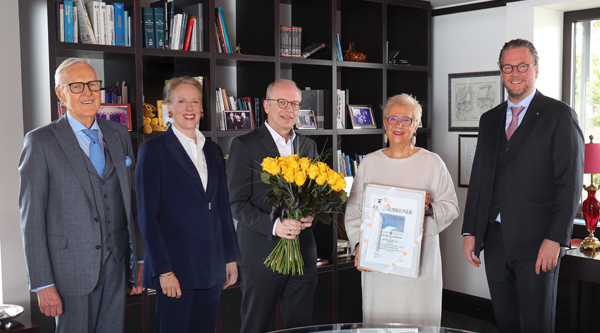 圖片說明:35年來,洪瑪嘉(右二)一直負責浩亭技術(shù)集團的形象和良好聲譽,當天正在慶祝她的入職周年紀念日。負責人力資源和法律事務(wù)的董事會成員Michael Pütz博士(中)與其家人洪狄馬(Dietmar Harting)、韓洪瑪莎(Maresa Harting-Hertz)和洪斐立(Philip Harting)(從左到右)當場送上祝賀。