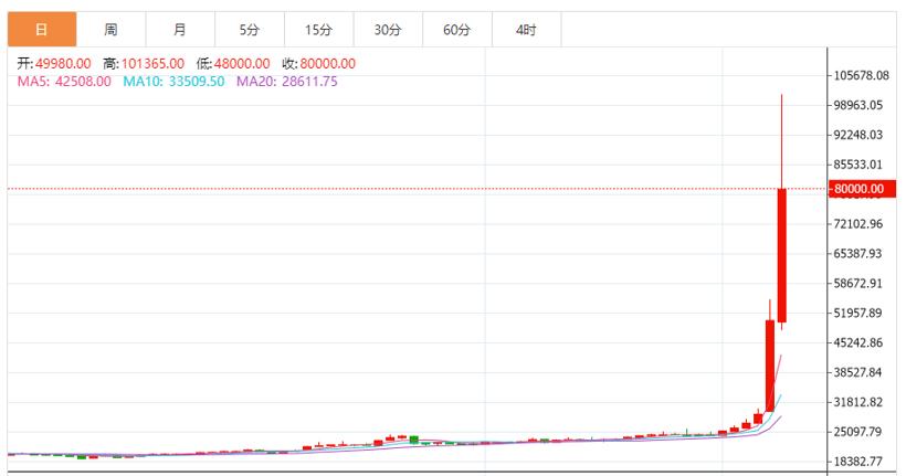 3月8日,倫鎳?yán)^續(xù)瘋狂,漲幅甚至達(dá)到了110%,創(chuàng)下了101365美元/噸的歷史天價(jià),兩日累計(jì)漲幅超過230%。