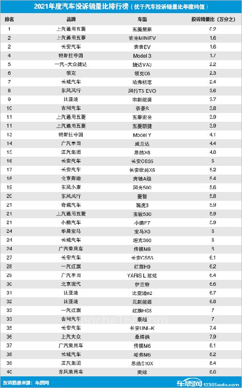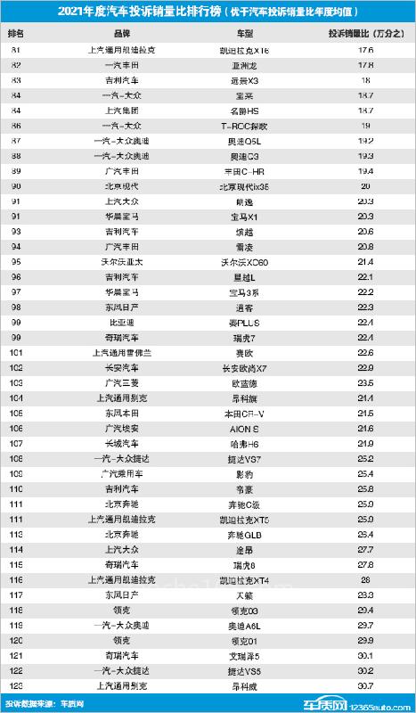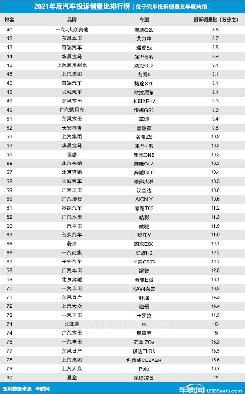 據(jù)國內(nèi)領(lǐng)先的缺陷汽車產(chǎn)品信息收集平臺車質(zhì)網(wǎng)的統(tǒng)計數(shù)據(jù)顯示,2021年國內(nèi)汽車投訴銷量比年度均值為萬分之30.9,數(shù)值近四年來首次出現(xiàn)下降,一定程度反映出汽車整體口碑出現(xiàn)轉(zhuǎn)好跡象。據(jù)乘聯(lián)會數(shù)據(jù)顯示,2021年汽車?yán)塾嬩N量共20,910,057輛,其中有銷量數(shù)據(jù)的車型共632款,由此得出國內(nèi)汽車年銷量平均值為33,085輛。據(jù)統(tǒng)計,2021年共有166款車型超過了汽車年銷量平均值,包括轎車71款,SUV車型87款,MPV車型7款,微面1款。其中,共有123款車型因投訴銷量比表現(xiàn)優(yōu)于汽車投訴銷量比年度均值而入選榜單,具體排名如下: