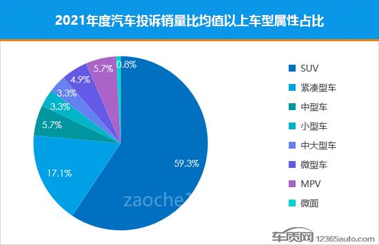 從2021年度汽車投訴銷量比均值以上的車型屬性占比來看,SUV車型占比接近六成,整體投訴銷量比表現(xiàn)優(yōu)于其他各車型,與其龐大的車型數(shù)量和市場銷量不無關(guān)系。此外,緊湊型車成為占比第二高的車型,但占比與2020年相比有所下降。相比之下,微型車本年度表現(xiàn)可圈可點,占比較2020年提高了2.4個百分點。