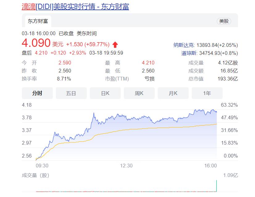 3月18日的滴滴美股股價(jià),圖片來源:東方財(cái)富網(wǎng)截圖