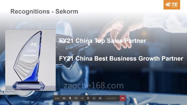 2022年3月17日,TE(中國區(qū))傳感器事業(yè)部和渠道事業(yè)部舉行代理商頒獎大會。會上,TE渠道事業(yè)部大中華地區(qū)銷售總監(jiān)、TE傳感器事業(yè)部中國區(qū)渠道銷售經(jīng)理為世強(qiáng)硬創(chuàng)平臺頒發(fā)2021財年“中國區(qū)最佳銷售伙伴獎”(FY21 China Top Sales Partner)與2021財年“中國區(qū)最佳業(yè)務(wù)拓展伙伴” (FY21 China Best Business Growth Partner)。這是首次有代理商同時獲得兩項(xiàng)分量最重的獎項(xiàng)。