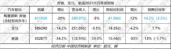 論及盈利能力,奔馳依然當(dāng)仁不讓,無論是去年全年還是四季度,奔馳在營業(yè)收入、息稅前利潤、銷售回報率等主要財務(wù)指標(biāo)上均保持領(lǐng)先。相比之下,寶馬的這幾項(xiàng)財務(wù)指標(biāo)在數(shù)值上雖略有不及,但增速均超過奔馳,息稅前利潤更是同比增長近4倍。奧迪方面,盡管銷售回報率也在10%區(qū)間,但營收、息稅前利潤等比之兩位德國老鄉(xiāng)都有著較大差距。