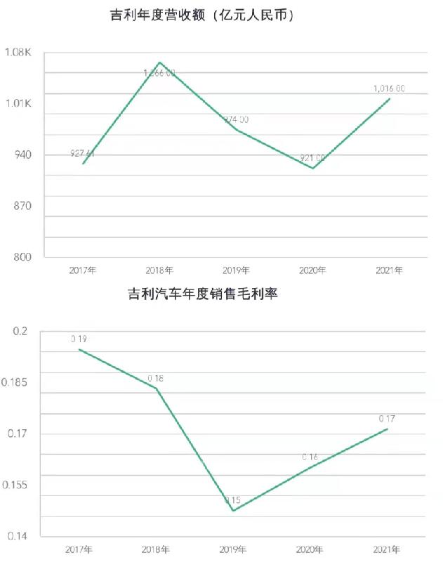財(cái)報(bào)顯示,2017-2020年吉利汽車營收分別為927.61億元、1066億元、974億元和921億元人民幣;汽車銷售毛利率分別為19.46%、18.32%、14.74%和16%。到了2021年,吉利汽車毛利率稍有提升,為17.13%。