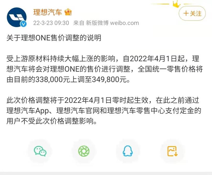 為了應(yīng)對(duì)原材料上漲,比亞迪、特斯拉、小鵬等新能源車企紛紛上調(diào)產(chǎn)品價(jià)格,來平衡制造成本。3月19日,理想汽車CEO李想在微博上預(yù)測(cè),“目前來看,和電池廠商已經(jīng)簽訂合同、確定了二季度電池漲價(jià)幅度的品牌,基本上都立刻宣布了漲價(jià)。還沒有漲價(jià)的,大部分是漲價(jià)幅度還沒有談妥的,等待談妥后也普遍會(huì)立刻漲價(jià)?!?BR> 果然,沒多久理想也向漲價(jià)妥協(xié)了。官方消息顯示,自4月1日起,理想汽車將會(huì)對(duì)理想ONE的售價(jià)進(jìn)行調(diào)整,全國統(tǒng)一零售價(jià)格將由目前的338,000元上調(diào)至349,800元。