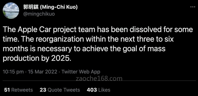隨著天風(fēng)國際分析師郭明錤的推文稱“Apple car的團隊已經(jīng)解散,如果想在2025年量產(chǎn)Apple Car,需要在3~6個月內(nèi)進(jìn)行團隊重組?!碧O果造車再現(xiàn)風(fēng)波。至于該爆料是真是假,此前有統(tǒng)計,郭明錤對蘋果爆料的準(zhǔn)確度是76.6%。